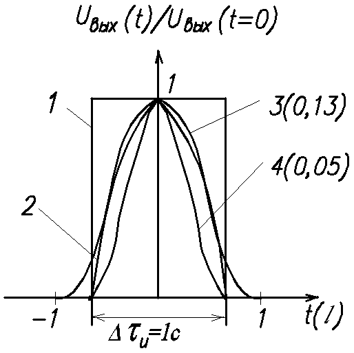 астотные характеристики для указанных случаев приведены на рис.4, где: 1 - неаподизованный преобразователь с равномерным перекрытием штырей; 2 - аподизованный, с линейным изменением перекрытия штырей; 3,4 - при изменении перекрытия