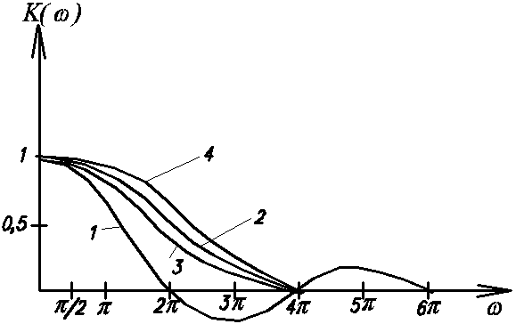 Так как отклик линейной цепи на δ-импульс есть ее импульсная функция, то импульс длительностью ∆τи на выходе выходного преобразователя тоже импульсная функция фильтра. Преобразование Фурье дает частотную характеристику, следовательно, на рис.2, г показана частотная характеристика фильтра. Эта характеристика имеет дополнительные выбросы и практически малопригодна, поэтому возникает задача значительно уменьшить уровень боковых лепестков (выбросов). Для этого необходимо, чтобы дискретный фильтр имел неоднородную структуру, т.е. чтобы отдельные звенья фильтра вносили разные "вклады".