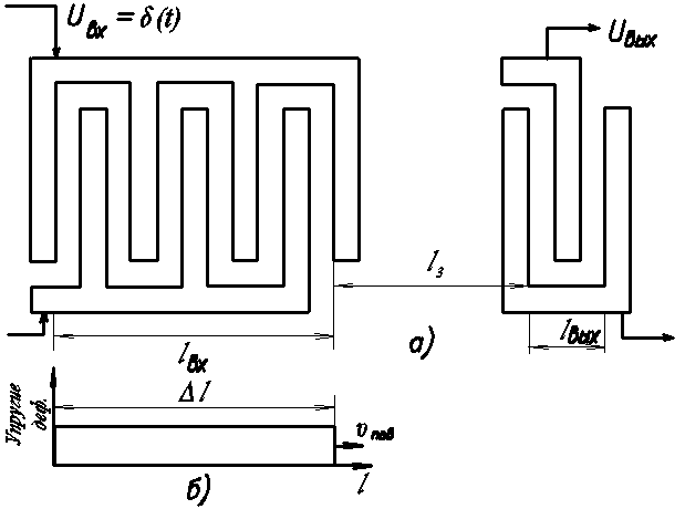 Основное применение для расчета получил метод δ-функций. Для получения расчетных соотношений для частотной характеристики предположим, что на штыри эквидистантного преобразователя действует сигнал в виде очень короткого импульса напряжения (δ-функция). В этом случае в каждом из промежутков между штырями возбуждается кратковременно электрическое поле. Вдоль звукопроврда будет двигаться поверхностная волна с λпов=2(a+h). Протяженность импульса этой волны в звукопроводе определяется не длительностью электрического импульса, а шириной входного преобразователя lвх. Огибающая этого импульса ∆l=lвх и направление его движения в одну из сторон показаны на рис.2, б. импульс длительностью ∆l=lвх со скоростью υпов двигается к выходному преобразователю. Для того чтобы этот преобразователь мало влиял на частотную характеристику, предположим, что он состоит из одной пары штырей. Импульс, проходя через выходной преобразователь с задержкой ∆τз= lз/ υпов, дает на радиочастоте f0=υпов/ /2(a+h) импульс напряжения с длительностью ∆τз≈ lвх/ υпов (рис.2, в). Так как