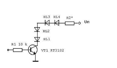У схемі рис.25 можуть бути різні типи світло діодів. різна їх кількість, різна напруга живлення Uп. Потрібно визначити номінал баластного резистора R2 та його потужність. Порядок розрахунку наступний. Визначимо тип світлодіода, температуру зовнішнього середовища.