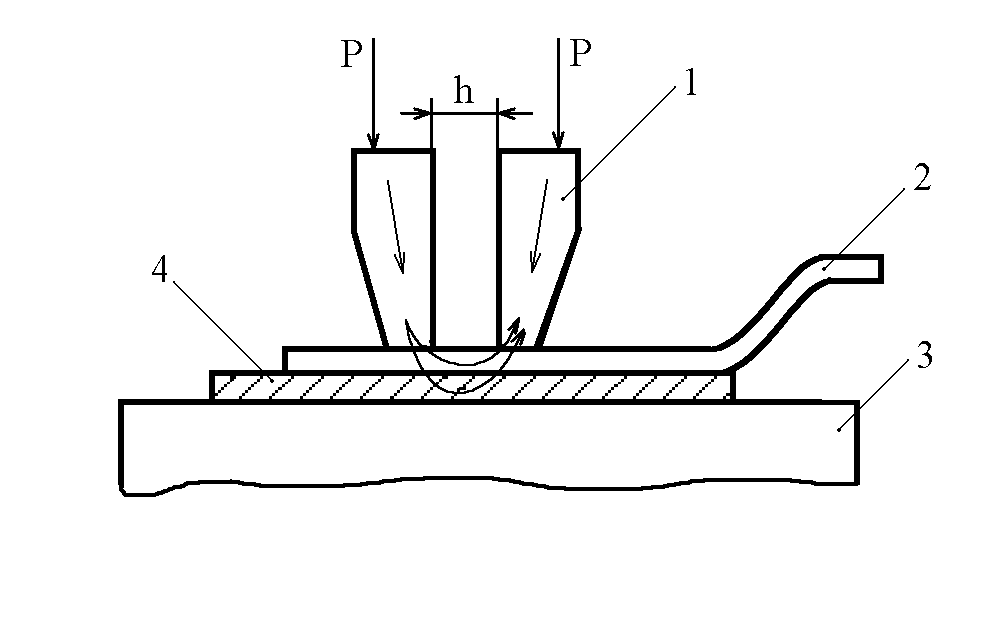 Сварка расщепленным (сдвоенным) электродом применяется в технологии электрического монтажа, в частности при получении контактных соединений планарных выводов ИМС и ЭРЭ с контактными площадками плат, плоских ленточных проводов с выводами печатных разъемов и др. Метод пригоден для сварки таких материалов, как медь, серебро, золото, алюминий, никель толщиной 0,03-0,5 мм. Подготовка свариваемых поверхностей заключается в предварительном отжиге материалов для снятия внутренних напряжений и увеличения пластичности, обезжиривании поверхностей химическими растворами. Сварка выполняется электродом, изготовленным из вольфрама или молибдена в виде двух токопроводящих частей, разделенных зазором h = 0,02-0,25 мм, либо с помощью диэлектрической прокладки (рис. 6.).