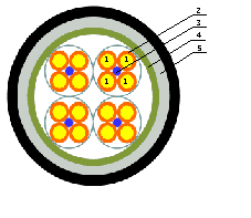 1 – токонесущая жила; 2 – изоляция; 3 – кордель-заполнитель; 4 – поясная изоляция; 5 – оболочка