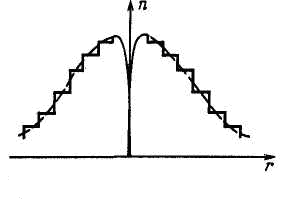 Специфика процесса MCVD такова, что профиль показателя преломления заготовки всегда отличается от желаемого по двум причинам. Первая состоит в том, что показатель преломления каждого слоя постоянен, поэтому профиль его в заготовке есть ступенчатая аппроксимация заданной функции. Вторая вызвана тем, что при температуре схлопывания, достаточно высокой: 1900...2100 °С, последние слои частично испаряются, причем скорость испарения ОеСЬ выше, чем скорость испарения 5Ю2- В результате в профиле показателя преломления заготовки в центре ее образуется провал, который сохраняется и в волокне (рисунок 2).