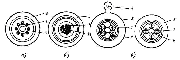 а—повивная скрутка; б—многоповивная скрутка; в—пучковая скрутка; 1 —оптическое волокно; 2 — промежуточный корд; 3 — оболочка кабеля; 4 — упрочающий элемент
