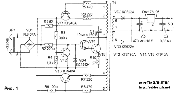 Випрямлена доданими мостом VD1 мережеве напруга через дільник R1 R3R4 подається на базу транзистора VT2, а через резистор R2 - на базу транзистора VT4 складеного, VT5. Протягом кожного напівперіод, поки напруга в точці з'єднання колекторів VT1, VT3 щодо емітера VT2 не перевищує 100 В, він закритий, VT4VT5 відкриті і конденсатор С1 заряджається через резистори R1, R10 і ділянка еміттерколлектор транзистора VT5. Коли ж напруга у зазначеній точці вище 100 В, VT2 відкривається і шунтується емітерний перехід складеного транзистора. Конденсатор С1 розряджається, живлячи автогенератор на транзисторах VT1, VT3, зібраний по схемі Роера (див. книгу Іванова-Циганова А. І і Хандогіна В. І. "Джерела вторинного електроживлення приладів НВЧ". - М.: Радіо і зв'язок, 1989) . Частота коливань автогенератора - приблизно 60 кГц. З вторинної обмотки трансформатора Т1 знімається напруга близько 7 В. Воно випрямляється діодами VD2, VD3, згладжується конденсатором С2 і стабілізується інтегральним стабілізатором DA1. Конденсатор СЗ знижує рівень високочастотних пульсацій.