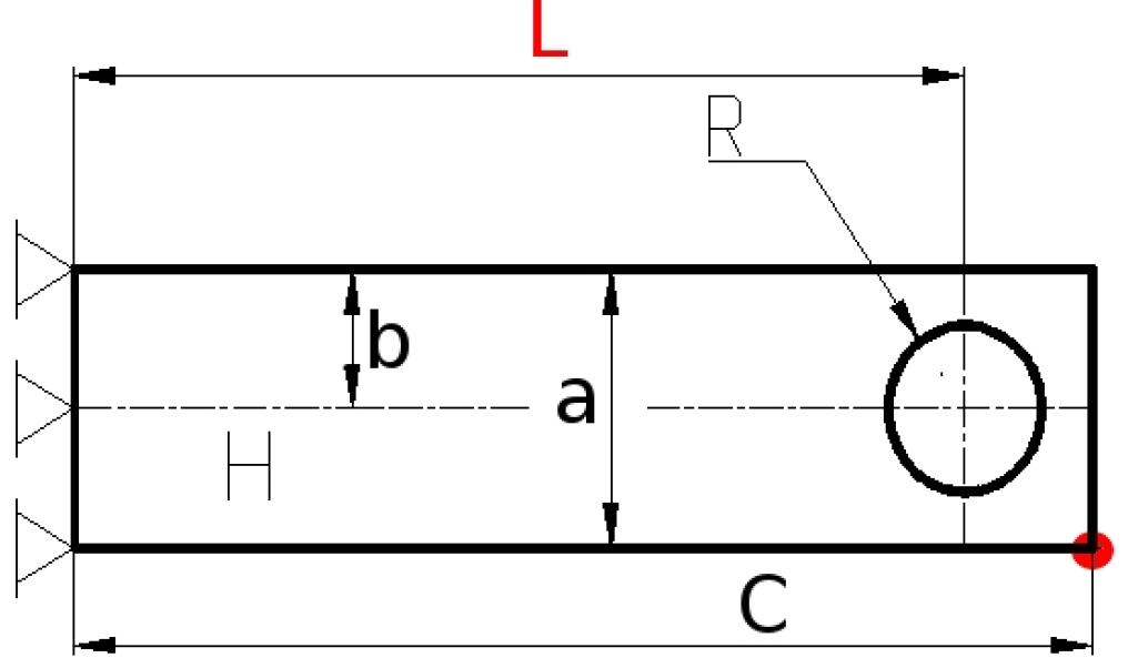 К свободному краю консольно-закрепленной плоской прямоугольной пластины с отверстием приложена нагрузка F в точке, отмеченной красным. Материал и размеры даны в таблице. Провести моделирование пластины под нагрузкой, определить деформацию пластины и напряжение в материале. Вид на рисунке сверху.