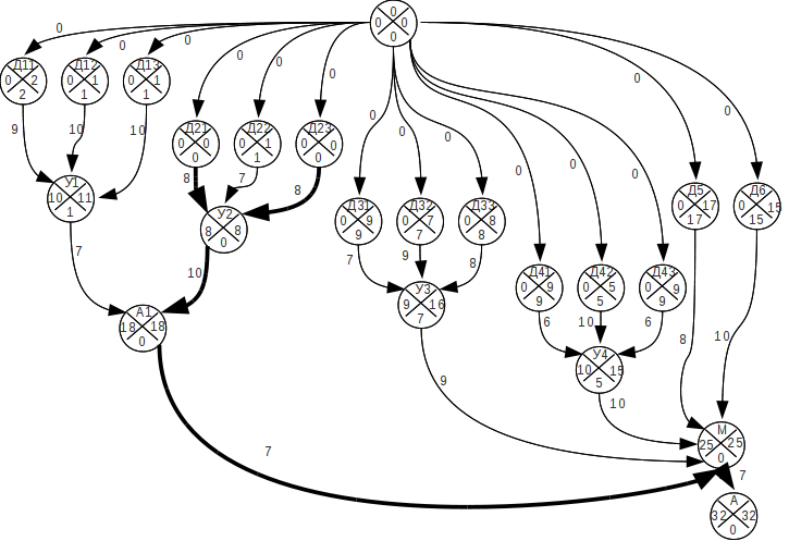 По определению нет никаких работ перед изготовлением деталей. Тогда по выше приведенным формулам высчитаем начало, конец и резерв по каждой из работ (см. рис. 15). Критический путь (не имеющий резервов) выделен.
