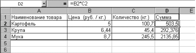 Здесь данные, которые содержатся в колонках Наименование товара, Цена (руб. / кг.), Количество (кг.)- основные, а данные в колонке Сумма- производные, т.к. вычисляются по формуле: