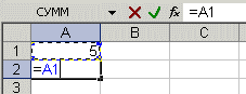 - после этого будет активизирован опять Лист 1 и в ячейке А1 появится следующая формула =Лист2!А5.