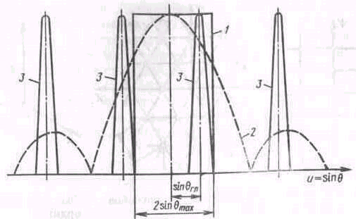 При размещении излучателей в узлах координатной сетки с двойной периодичностью синфазное сложение полей отдельных излучателей решетки возможно не только в направлении главного максимума ДН, но и в других направлениях, которым соответствует пространственный фазовый сдвиг, компенсирующий сдвиг фазы между излучателями за счет возбуждения. В этом случае помимо главного максимума существуют еще и дифракционные максимумы высших порядков, пространственная ориентация которых зависит от расстояния между излучателями. При уменьшении этого расстояния число дифракционных максимумов, находящихся в области действительных углов, уменьшается. Для нормальной работы решетки необходимо, чтобы в области действительных углов находился лишь один главный максимум, а дифракционные отсутствовали.