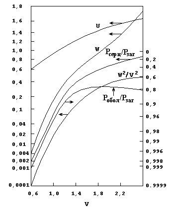 Рисунок 1 – Змінення різних характеристик розповсюдження LP>01> моди в волокні зі східчастим ППЗ в залежності від індекса V.