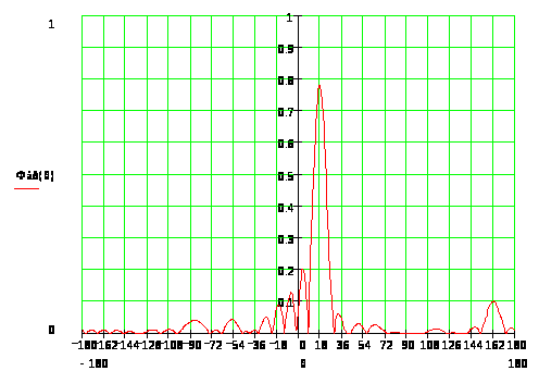 Диаграмма направленности множителя решетки представлена на рис.3, а диаграмма направленности АР представлены рис.4 для случая α =0 и на рис.5 для α =30° в плоскости Е. Для плоскости Н ДН будет иметь вид ДН одиночного излучателя.