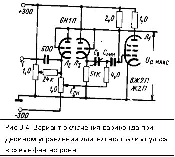 Если перед селектором поставить еще и блокинг-генератор с варикондом, управляемый тем же (или другим) модулирующим напряжением, то будет изменяться частота следования импульсов в кодовой группе. Можно в фантастрон включить вариконд по схеме с двойным управлением (рис.3.4) и изменять дополнительно период следования пачек кодовых групп по нужному закону во времени и т.д.