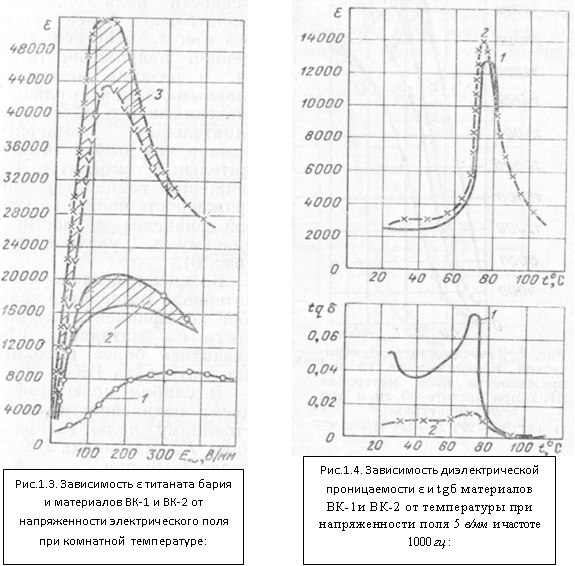 Точка Кюри материалов ВК-2 и ВК-1 соответствует одной и той же температуре — примерно 75°С. При воздействии слабого электрического поля (E~≈2÷5 в/мм) с частотой 50—106 гц кривые температурной зависимости ε этих материалов различаются мало, тогда как кривые зависимости tg б от температуры для материала ВК-2 лежат значительно ниже, чем для материала ВК-1 (рис.1.4). При повышенных напряженностях поля значения tgб материалов ВК-1, ВК-2 и титаната бария почти одинаковы, их максимальные значения равны 0,3—0,4.