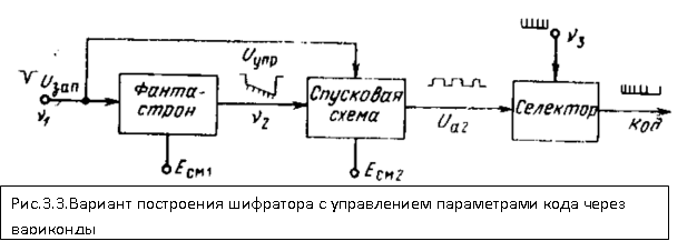 Вариант схемы шифратора с селектором изображен на рис.3.3. Он является простейшим и составлен специально для примера из фантастрона и спусковой схемы. Несмотря на крайнюю простоту такого шифратора с варикондами, с его помощью можно получить весьма сложные и многочисленные комбинации кодов.