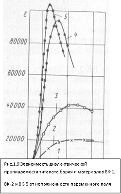 Материал ВК-5.Он имеет самые высокие нелинейные свойства и самые высокие значения диэлектрической проницаемости εмакс из всех известных в настоящее время керамических еегнетоэлектриков. На рис.1.9 приведены зависимости диэлектрической проницаемости BaTiO3, ВК-1, ВК-2 и ВК-5 от напряженности переменного поля. Его коэффициент нелинейности K~ = 40÷50, εмакс =80000÷100000. Максимальное значение диэлектрической проницаемости материала ВК-5 достигается при напряженности поля Eмакс =80÷100 в/мм.