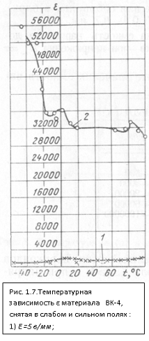 Коэффициент нелинейности K~ материала ВК-2 при отрицательных температурах много выше, чем при положительных. Это происходит потому, что при понижении температуры значение εнач этого материала в случае воздействия слабой напряженности поля снижается значительно более резко, чем при воздействии повышенной напряженности поля, и разница между начальными и максимальными значениями ε в области отрицательных температур больше, чем в области положительных температур. При снижении температуры напряженность поля, при которой значение ε достигает максимума, увеличивается (рис.1.5).