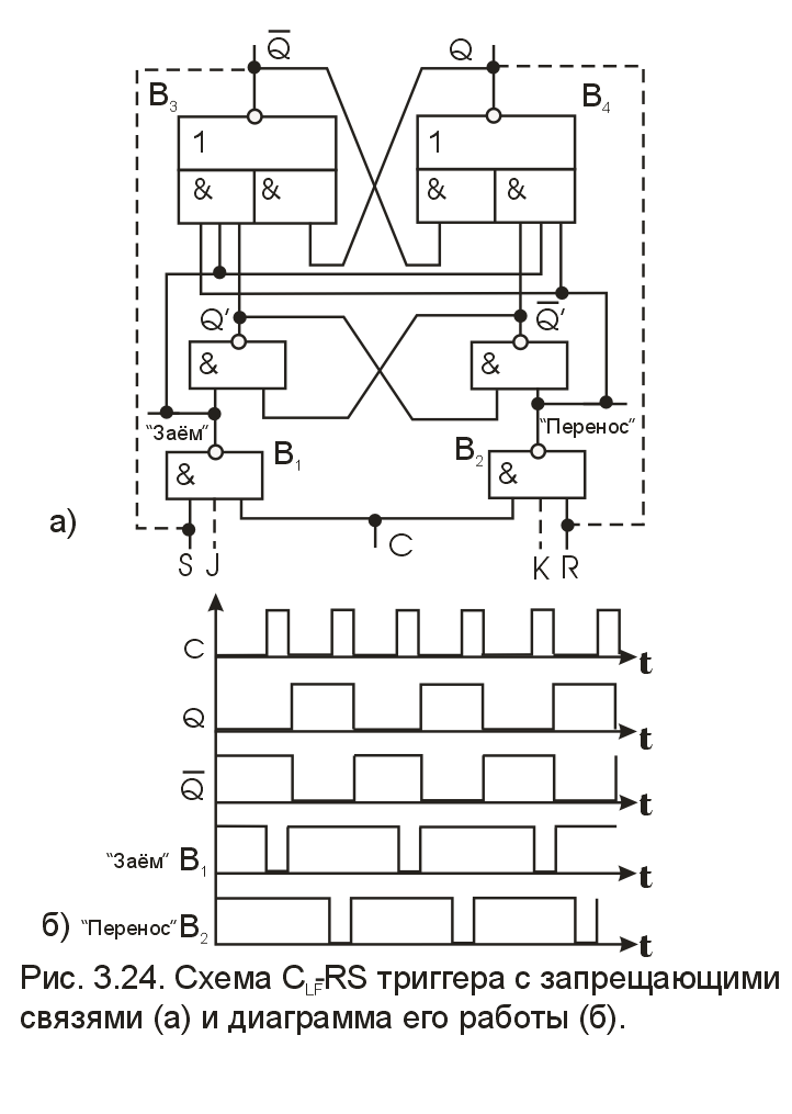 Предположим, что триггер находится в состоянии Q=0, а на входе D уровень логической 1 (D=1). В этом случае имеет место следующее распределение потенциалов на выходах вентилей схемы управления триггера: В>1>=В>2>=В>3>=1, В>4>=0. В результате только вентиль В>2> оказывается подготовленным к переключению, так как на одном из его входов присутствует уровень 1 с выхода вентиля В>1>. При поступлении ТИ на вход С на выходе элемента В>2> сформируется сигнал с уровнем 0, под действием которого триггер установится в состояние Q=1. Одновременно сигнал с выхода вентиля В>2>, поступая на входы вентилей В>1> и В>3>, принудительно удерживает их в состоянии 1 в течение всей длительности ТИ, и тем самым смена информации на входе D не отразится на состоянии триггера. Это достаточно наглядно иллюстрируется временной диаграммой (рис. 1, в).