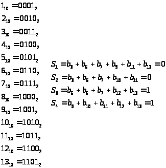 Щоб закодувати повідомлення а, беруться як b>j>, j не дорівнює ступеню двійки, відповідні біти повідомлення і відшукуються, використовуючи отриману систему рівнянь, ті b>j>, для яких j- ступінь двійки. У кожне рівняння входить тільки одне b>j,> j=2j. У виписаній системі b>4> входить в 1-е рівняння, b>2> - в друге і b>1> - в третє. У розглянутому прикладі повідомлення a=0111 буде закодовано кодовим словом b=0001111.