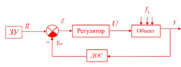 Объектом управления является барабан котла, в котором регулируется физическая величина Y (уровень воды). На объект действуют внешние возмущения fi приводящие к изменению регулируемой переменной Y. Регулирование объектом осуществляется путём изменения управляющего сигнала U. Регулируемая переменная Y измеряется датчиком обратной связи – ДОС и преобразуется в нормированный выходной сигнал Yoc, который в сравнивающем устройстве сравнивается с нормированным сигналом задания g, формируемым задающим устройством ЗУ, или системой управления вышестоящего уровня. Сигнал отклонения (ошибки) ε поступает на регулятор, который формирует управляющее воздействие U. В состав регулятора входит большое число различных блоков и устройств, обеспечивающих требуемое преобразование сигналов. Это исполнительное устройство (исполнительный двигатель или исполнительный механизм) с регулирующим устройством (клапан, задвижка, заслонка, вентиль и др.); усилитель мощности; модуляторы; демодуляторы; динамические преобразователи (интеграторы, дифференциаторы), формирующие требуемый закон регулирования; нелинейные преобразователи; корректирующие устройства и др. В промышленных системах регулирования различными объектами разными будут регулируемая величина, датчик обратной связи и регулирующее устройство. Все остальные блоки регулятора имеют унифицированные внешние связи и работают с унифицированными сигналами, что позволяет с их помощью реализовывать регуляторы в самых различных промышленных системах регулирования.