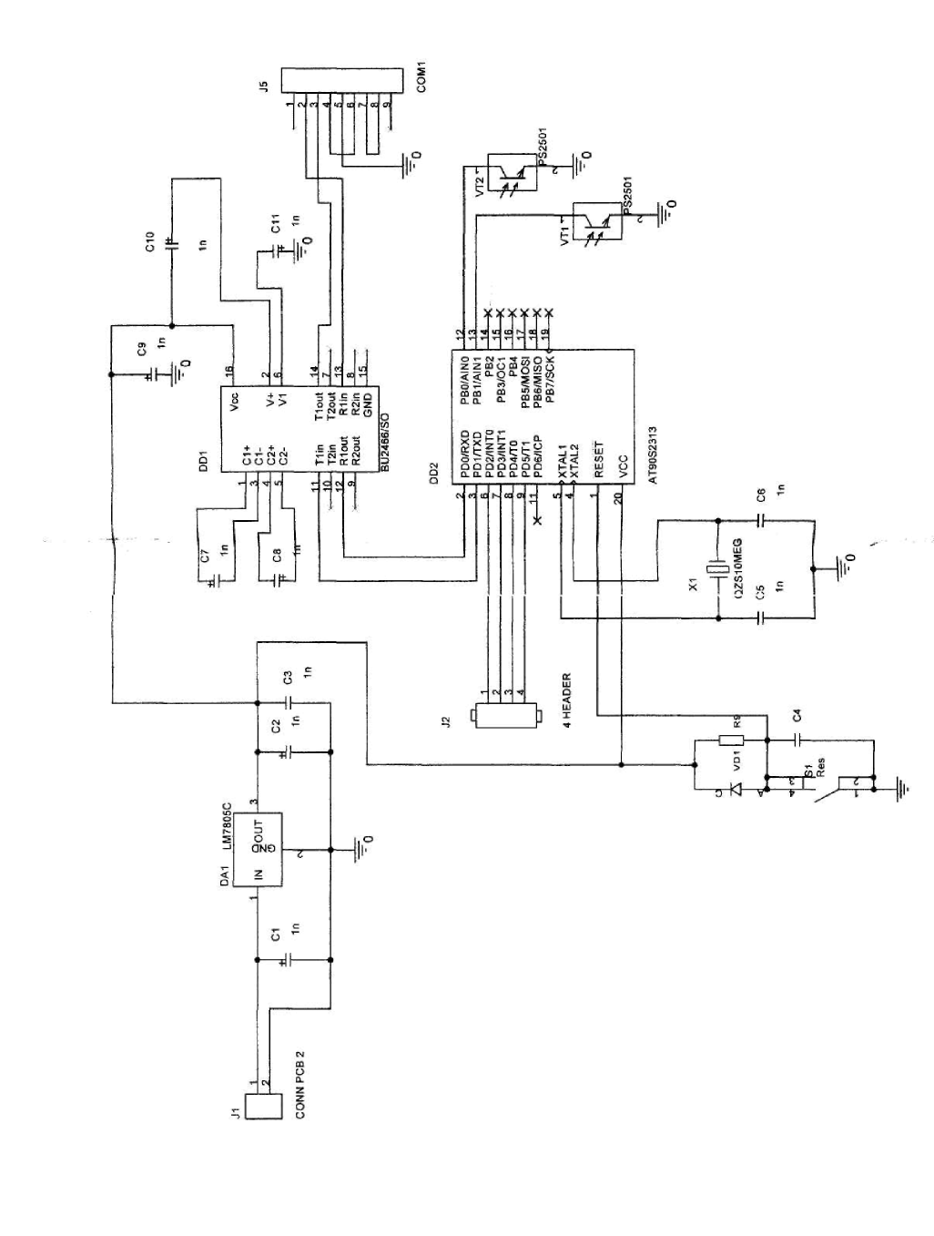 Блок передачи информации реализован на микросхеме МАХ232. Устройство управления организовано на микроконтроллере семейства Classic AT90S2313-10. Данный микроконтроллер имеет память программ 2 Кбайт, ОЗУ 128 байт и EEPROM-память данных 128 байт. Максимальное количество контактов ввода/вывода 15.