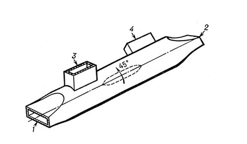 На рисунке 1, 2, 3, 4 - плечи циркулятора в виде отрезков стандартных волноводов с прямоугольным сечением, расположенных под углом 45° последовательно по отношению друг к другу; пунктиром изображён ферритовый образец, обеспечивающий поворот плоскости поляризации волны на 45° в направлении, указанном стрелкой, в результате энергия, если её подвести к плечу 4, поступает только в плечо 1, к плечу 3 - только в плечо 4 т.д.