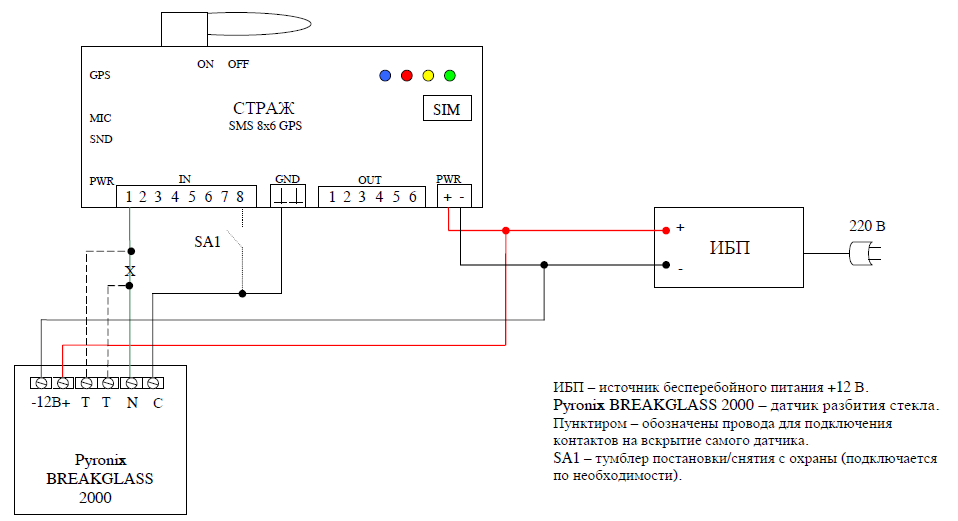 Срабатывание датчиков контролируется независимо друг от друга, в соответствии с установками логики работы, которые располагаются в SIM-карте. Пример подключения одного из датчиков (датчика разбития стекла Pyronix) к системе "Страж SMS 8x6 GPS" представлен на рисунке 2.