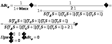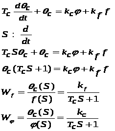 Сигнал разбаланса мостовой схемы (сигнал рассогласования) ΔU = U0 –UД усиливается усилителем 4, выходное напряжение которого Uy управляет исполнительным двигателем 5. Последний через редуктор 6 перемещает заслонку 3, тем самым изменяет величину регулирующего воздействия φ на входе объекта регулирования. За счет соответствующего изменения угла поворота заслонки и компенсируется отрицательное влияние внешних возмущений f (изменение температуры, влажности атмосферного воздуха и др.), действующих на объект регулирования. При исследовании САР в качестве главного возмущения следует рассматривать изменение температуры атмосферного воздуха, приняв условно, что его влажность не меняется. Динамические свойства элементов САР описываются следующей системой уравнений: