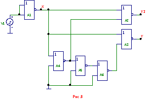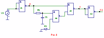 а) сопоставить конфигурацию, состав Схемы 8 и Схемы 7, проанализировать работу и сформулировать вывод об их свойствах и наличии гонок в Схеме 8; построить временные диаграммы сигналов Y(t) и Y1(t);