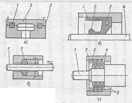 Манжетное уплотнение 1 (рис. 2, б) применяют при незначительной частоте вращения вала 4. Степень уплотнения регулируется пружинящим кольцом 2 и каркасным кольцом 3.