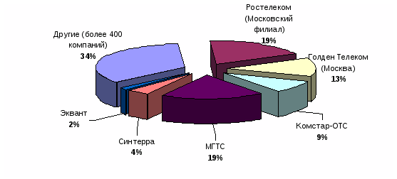 Ведущим московским оператором рынка телефонной связи является ОАО "Московская городская телефонная сеть" (МГТС), долгое время бывшее и единственным (за исключением, некоторых ведомственных операторов) поставщиком данного вида услуг на рынок Москвы. Развитие рыночных отношений привело к возникновению в начале 90-х годов так называемых "альтернативных" операторов связи [35]. Своим появлением такие компании обязаны слабому развитию отечественной телекоммуникационной инфраструктуры, не отвечающей современным требованиям. В настоящее время на рынке работают более 50 весомых операторов, условно их можно разделить на следующие группы:
