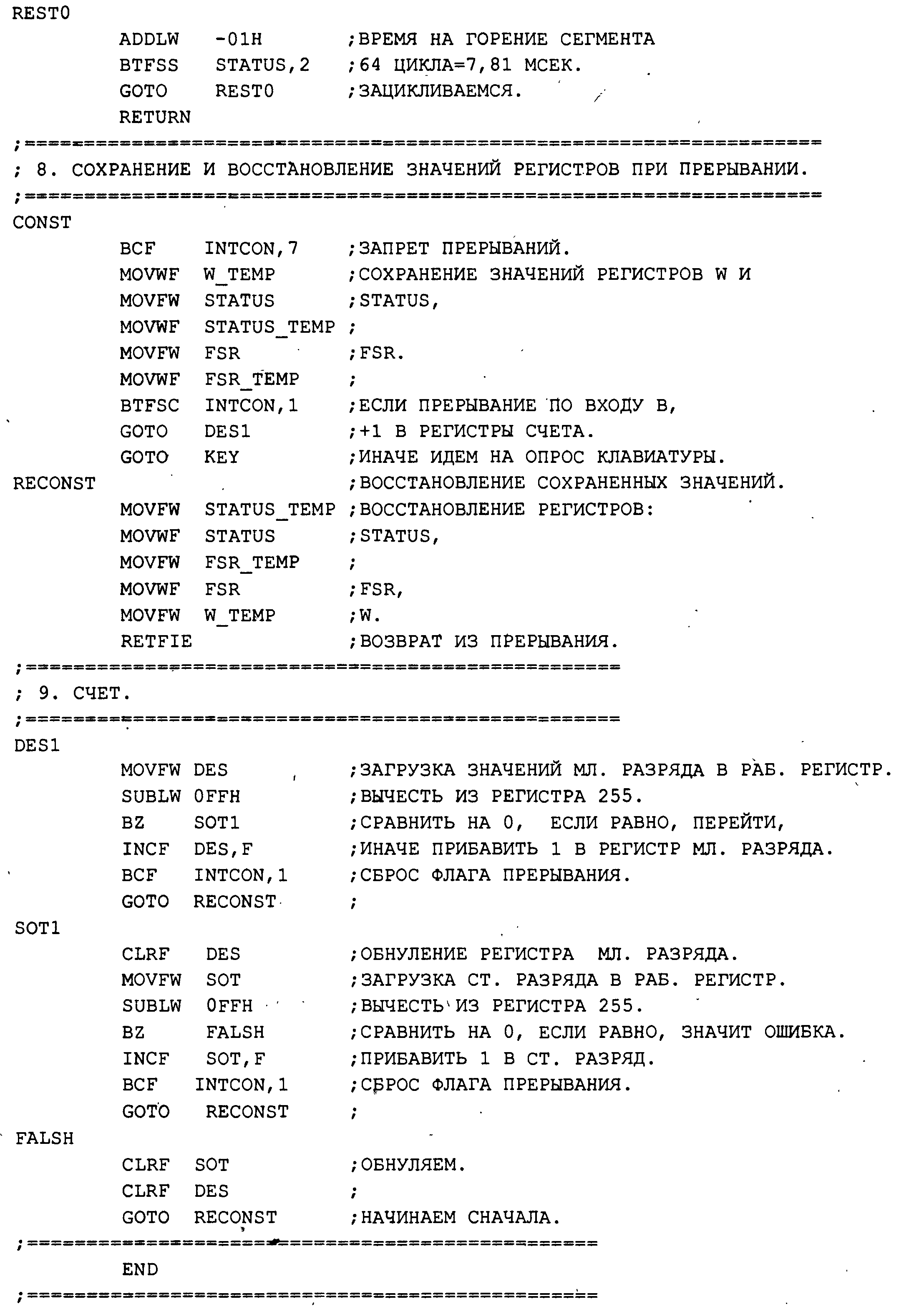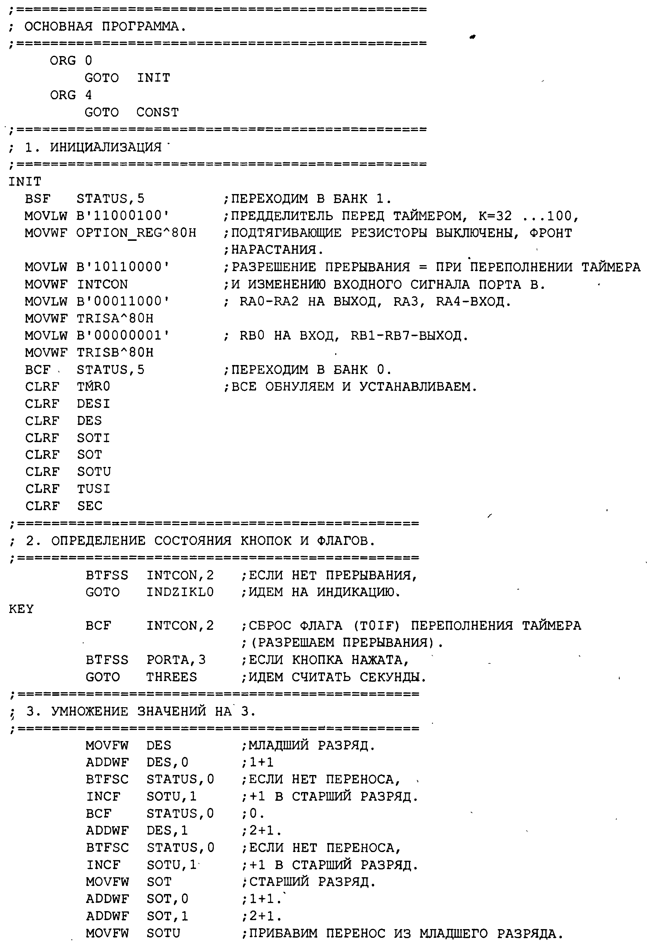 Если прерывание произошло по переполнению таймера, то определяется состояние переключателя предела измерения и, если переключатель на пределе одной секунды, двоичное значение 16-разрядного счетчика умножается на 3 (2N х 3). 16-разрядный счетчик обнуляется, готовясь к новому циклу измерения. Полученное двоичное значение перекодируется в трехразрядное двоично-десятичное число и переписывается в регистры индикации. После восстановления значений регистров индикация происходит с новыми данными. То есть индикация обновляется каждую секунду. Если установлен предел измерения, равный 3 секундам, то при переполнении таймера значение счетчика секунд увеличивается на единицу.