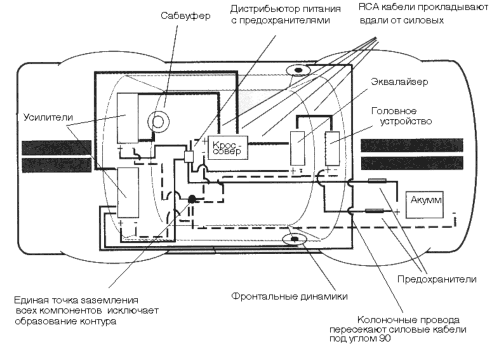 Существенно важно правильно проложить провода и убедиться в том, что все компоненты системы заземлены в одном месте. Точки, где заземления могут создавать положение "контура" следующие: