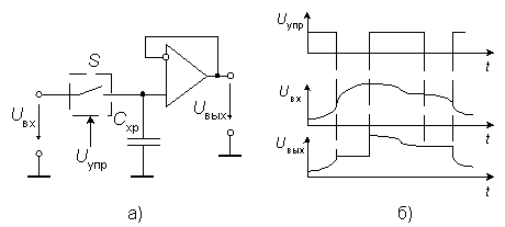 При сборе информации и ее последующем преобразовании часто бывает необходимо зафиксировать значение аналогового сигнала в некоторый момент времени. Некоторые типы аналогово-цифровых преобразователей, например, последовательного приближения, могут давать совершенно непредсказуемые ошибки, если их входной сигнал не зафиксирован во время преобразования. При смене входного кода цифро-аналоговых преобразователей из-за неодновременности установления разрядов наблюдаются выбросы выходного напряжения. Для устранения этого явления на время установления также следует зафиксировать выходной сигнал ЦАП. Устройства выборки - хранения (УВХ) (слежения - хранения), выполняющие эту функцию, должны на интервале времени выборки (слежения) повторять на выходе входной аналоговый сигнал, а при переключении режима на хранение сохранять последнее значение выходного напряжения до поступления сигнала выборки. Схема простейшего УВХ приведена на рис. 1а.