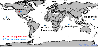 Наземный сегмент системы GPS состоит из 5-и контрольных станций и главной станции управления, расположенных на военных базах США – на островах Кваджалейн и Гавайях в Тихом океане, на острове Вознесенья, на острове Диего-Гарсия в Индийском океане и в Колорадо-Спрингс, они преведены на рисунке 1. В задачи станций мониторинга входит прием и измерение навигационных сигналов поступающих с GPS спутников, вычисление различного рода ошибок и передача этих данных на станцию управления. Совместная обработка полученных данных позволяет вычислить отклонение траекторий спутников от заданных орбит, временные сдвиги бортовых часов и ошибки в навигационных сообщениях. Мониторинг состояния GPS спутников происходит практически непрерывно. «Загрузка» навигационных данных, состоящих из прогнозируемых орбит и поправок часов для каждого из спутников, осуществляется каждые 24 часа, в момент, когда он находится в зоне доступа станции управления.