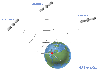 Принцип действия спутниковой GPS навигации основан на определении расстояния от текущего положения до группы спутников. Точное местоположение GPS спутников известно из данных эфемерид и альманаха, передаваемых в навигационных сообщениях. Зная расстояние до трех спутников, можно определить текущее местоположение, как точку пересечение трёх окружностей (рисунок 2). Расстояние до спутников определяется простым уравнением