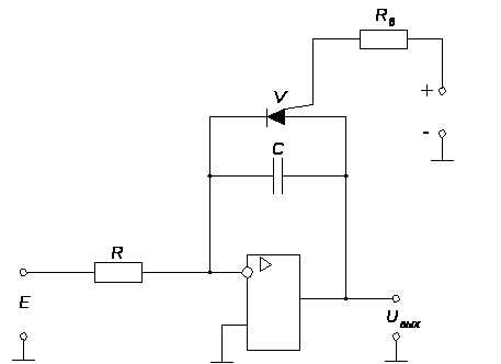 При исключении из данной схемы тиристора, подключенного параллельно конденсатору C, получается интегратор. Выходное напряжение определяется выражением: