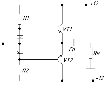 Если R>н>< 300÷500 Ом, то нужен каскад по схеме ОК или двухтактный усилитель мощности. В нашем случае будем использовать именно двухтактный УМ.