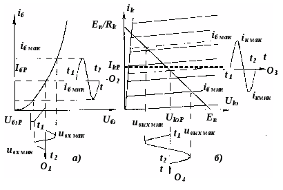 Согласно с изменением тока базы будет изменяться ток и напряжение коллектора. При этом точка, соответствующая изменяемому значению тока базы, будет перемещаться по линии нагрузки (рисунок 4.4, б) в пределах, определяемых токами базы iб мин и iб мак. Изменения тока и напряжения коллектора во времени отображены на осях О3 и О4. При отсутствии выходной характеристики используемого транзистора, измененные значения тока коллектора можно определить из выражений
