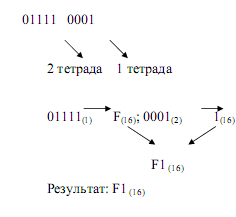 Для перевода двоичного числа в шестнадцатеричную систему счисления необходимо разложить число на тетрады и перевести его в шестнадцатеричную систему счисления, затем сложить их согласно приоритету тетрада.