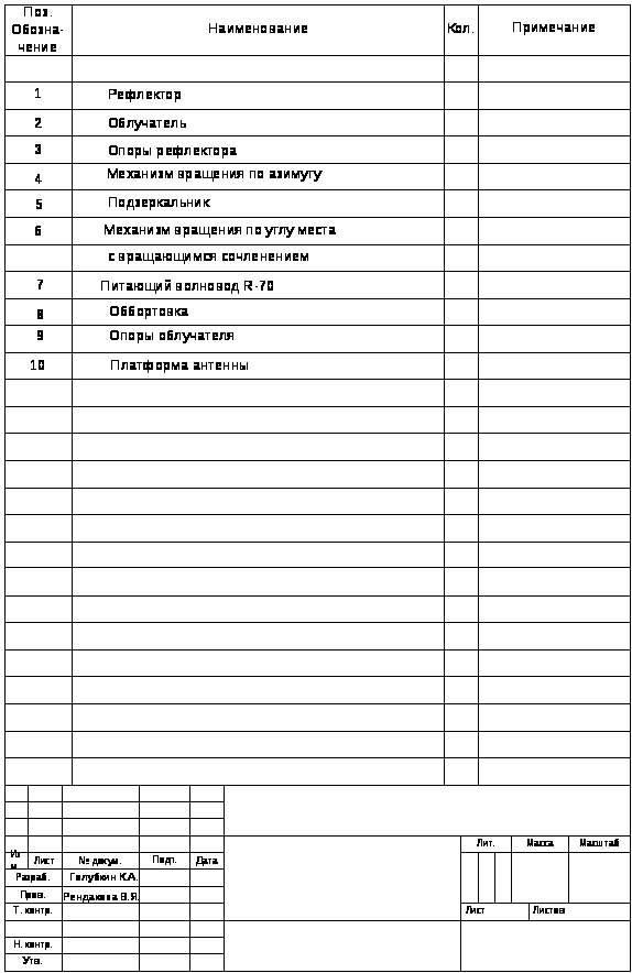 Полученная зеркальная антенна состоит из следующих частей (см. приложение):