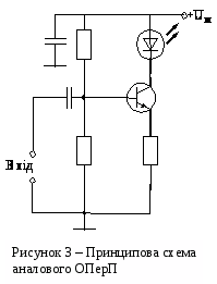 На рис. 3 наведена одна з досить простих принципових схем аналового ОПерП. У схемі використано підсилювальний каскад на біполярному транзисторі, який включено за схемою з загальним емітером. Він перетворює вхідну напругу, що подається на базу в колекторний струм, який протікає через джерело випромінювання. Такий каскад і є генератором струму накачування або перетворювачем напруга-струм.
