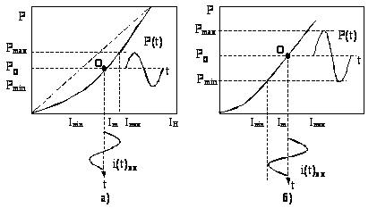 На рис.2а, б наведені положення робочої точки та епюри вхідних сигналів для світлодіода (рис.2а) та лазерного випромінювача (рис.2 б).