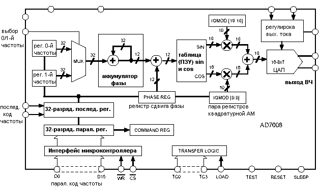 В качестве примера приведем структурную схему DDS AD7008, имеющую встроенные средства квадратурной цифровой амплитудной модуляции (с цифровыми перемножителями квадратурных сигналов) и цифровое объединение квадратур перед подачей их на ЦАП.