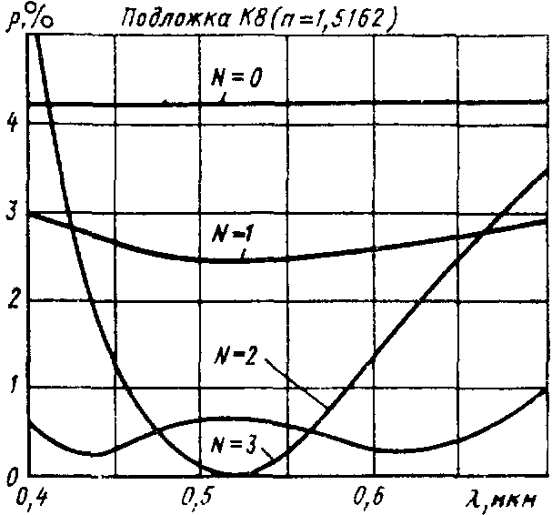 При тришаровому просвітлінні досягається значне зниження відображення в широкій області спектра. На рис. 6 наведені спектральні криві коефіцієнта відображення для порівняння ефективності покрить, що просвітлює, з різним числом шарів.