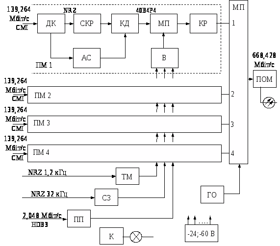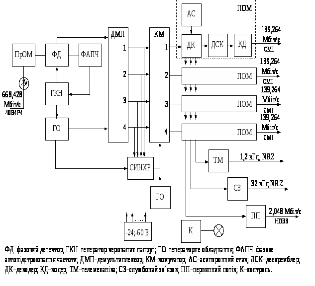 ДК–декодер; СКР–скремблер; КД– кодер; МП–мультиплексор; КР– коректор; АС–асинхронний стик; В–пристрій введення сервісних потоків; ПМ–передавальний модуль; ПОМ–передавальний оптичний модуль; ТМ– телемеханіка; СЗ –службовий зв`язок; ПП– первинний потік; К–контроль; ГО–генераторне обладнання; МП–мультиплексор.