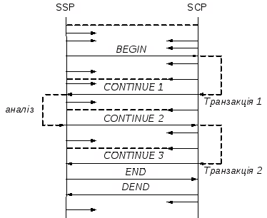 Після отримання повідомлення ВЕGIN, що ініціює запит на інтелектуальну послугу, SСР обробляє зазначений запит і через деякий проміжок часу видає убік SSР повідомлення CONTINUE та іншу інформацію, необхідну для здійснення комутації та обслуговування необхідної послуги. Після одержання зазначеної інформації SSР повідомленням END інформує SСР про закінчення обміну, а SСР повідомленням DEND підтверджує відсутність помилок і згоду на завершення обміну.