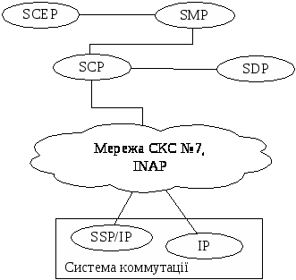 Вузли SSCP і SN містять у собі всі необхідні функції (SSF, SCF, SDF і SRF), інтегровані на єдиній платформі і є незалежними та повністю автономними мережними елементами, що реалізують послуги IN (рис. 3).