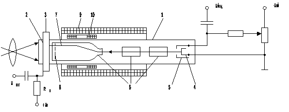 Вторым функциональным узлом видикона является электронный прожектор, включающий в себя подогревный катод 4, модулятор 5 и аноды 6. Он обеспечивает ускорение и формирование узкого пучка электронов. Непосредственно у сигнальной пластины расположена мелкоструктурная сетка 8, которая создает равномерное тормозящее поле перед мишенью. Благодаря этому электроны падают перпендикулярно на фотослой по всей его площади. Фокусировку и отклонение электронного луча 7 обеспечивает магнитная фокусирующе-отклоняющая система. Для фокусировки электронного луча используется соленоид 9. Пролетающие сквозь него электроны группируются (закручиваются по спирали) вблизи его оси. Отклонение луча производится парами отклоняющих катушек 10 – горизонтальной (строчной) и вертикальной (кадровой).
