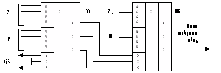 Для лучшего понимания цифровой амплитудной селекции полезно более подробно остановиться на некоторых особенностях цифрового компаратора. Его можно построить на двух микросхемах, например, К555СП1. Эти микросхемы представляют собой компараторы, сравнивающие два четырехразрядных числа А и В, и выдающие сигналы низкого уровня на трех выходах соответственно при выполнении условий A > B, A = B и A < B. Эти микросхемы имеют входы для наращивания, благодаря чему можно увеличивать разрядность сравниваемых чисел. Соединение микросхем в амплитудном селекторе показано на рис.4.